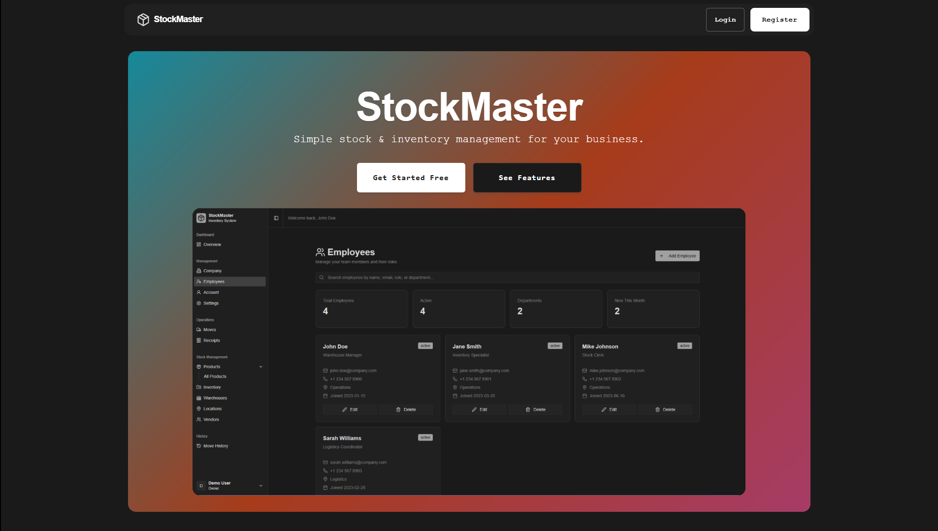 StockMaster is your all-in-one solution for managing products, warehouses, and teams. Built for businesses that demand speed, reliability, and a beautiful user experience.